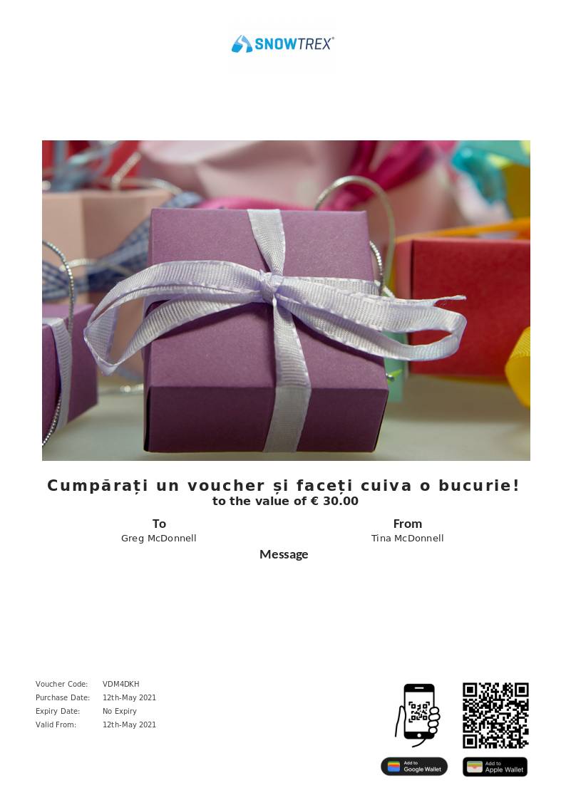 RO - SnowTrex - Voucher cadou allows you to purchase instantly printable gift vouchers, special offers and tickets using the Voucher Connect platform.